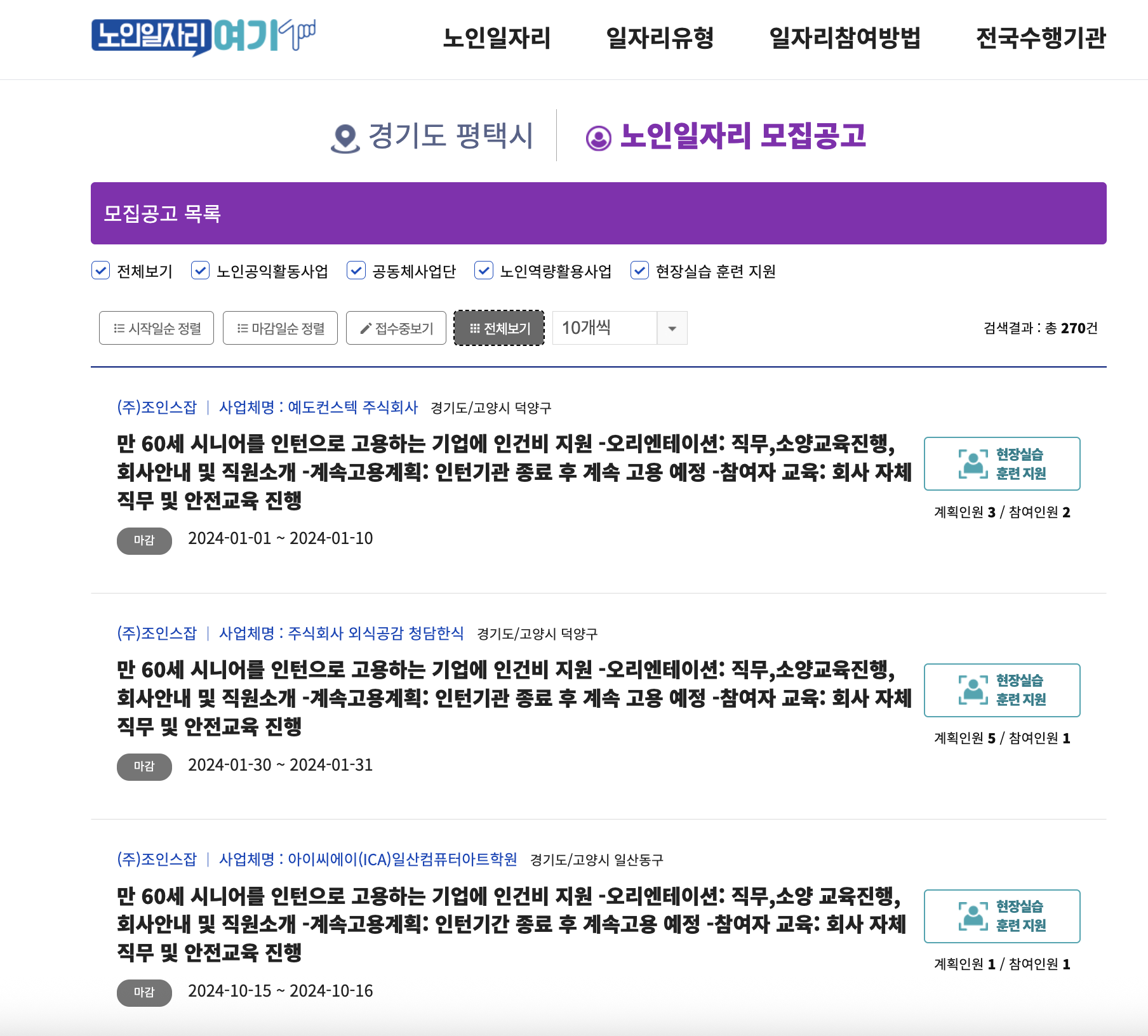 과거 진행되었던 사업들을 살펴보면 평택시 노인일자리의 특징을 잘 알 수 있습니다.