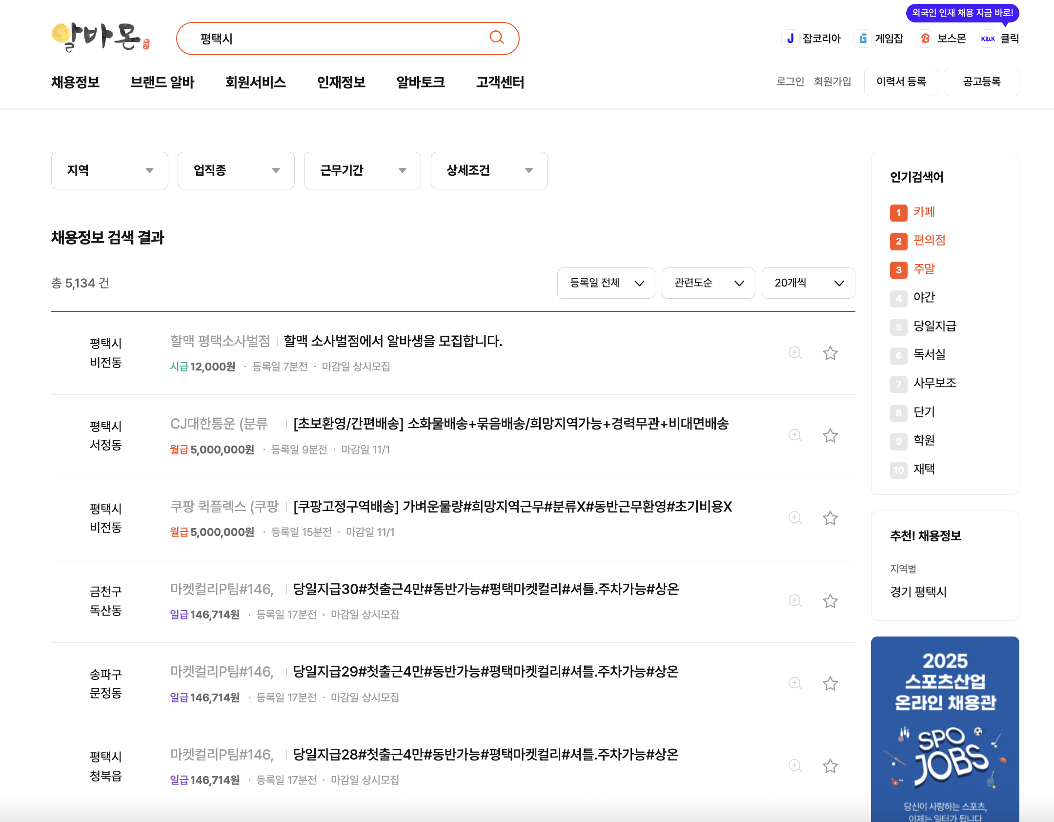 알바몬과 알바천국에서 평택시 아르바이트 채용 정보를 확인해 보겠습니다.