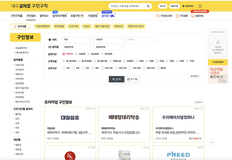 알바 검색 페이지에서는 지역, 업종, 근무일, 근무시간 등 다양한 필터를 활용해 원하는 조건의 아르바이트를 찾을 수 있습니다. 특히 상단에는 현재 대구 지역에 30개 59,000개의 알바 정보가 있다는 것을 확인할 수 있어, 선택의 폭이 매우 넓습니다.