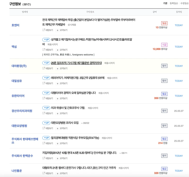 업체명 모집분야 특징 급여/인원 홍원미 전국 제빵교육 제빵안내 부담 월급, TODAY 13 인원이상 먹봄 성격좋고 야간가능하시는분 서울시내, TODAY 시급 12,000원 이상 원뜰당 전화상담 지점관리인 200만원 월급제, 25.05.12 엠제이컨설팅 치킨전문 경력없어 주5일근무 월급제, 25.05.07 7 인원 달성공단식당 달성구 비스출집 가사식당 월급제, 25.05.07 240 인원 김소연 클라브 Live & Cafe 김소연 클라브 라이브 7090 월급제, 25.04.28 눈여겨볼 점은 일부 공고에 '[외국인 근무가능, 급여 우대, foreigners welcome]'이라는 표시가 있어 외국인 구직자도 지원 가능하다는 점입니다. 또한 'TIP' 표시가 있는 공고는 급여나 근무 조건이 좋은 추천 공고인 경우가 많습니다.